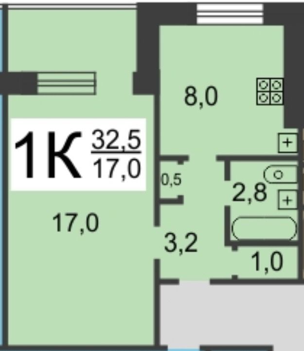 Площадь (кв.м.) Общая: 34.8 Жилая: 17 Кухня: 8 34.8 / 17 / 8