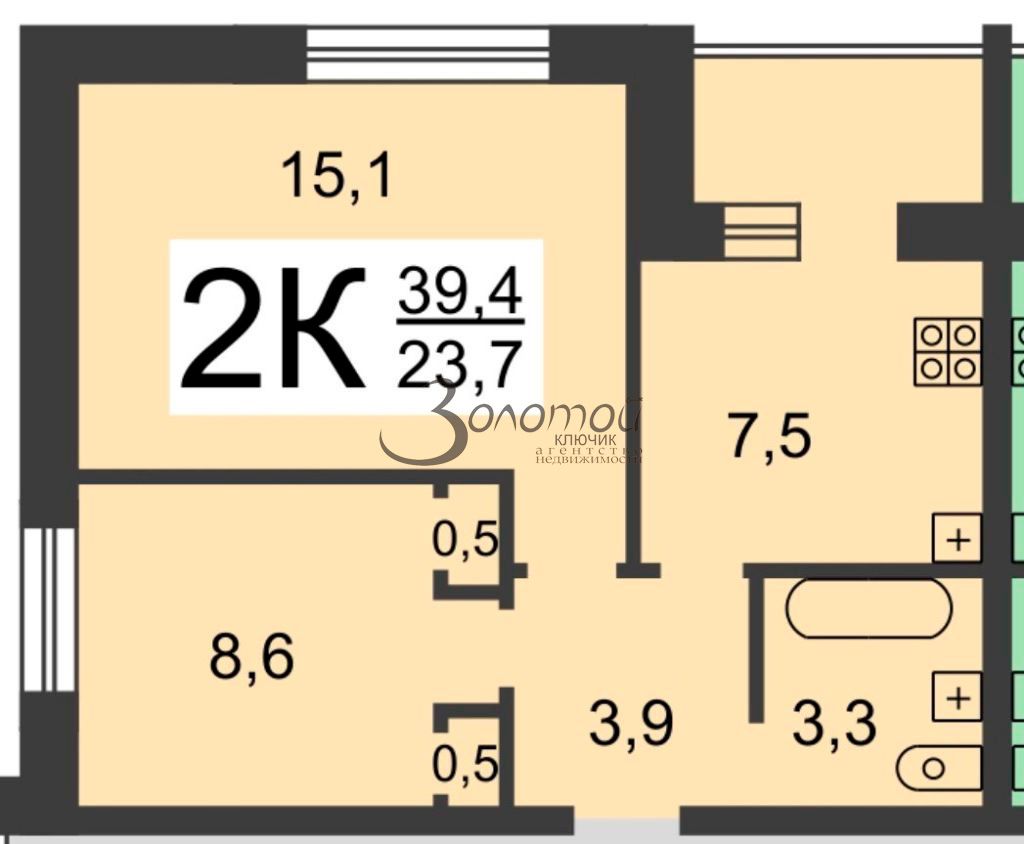 | Площадь (кв.м.) | Общая: 39.4 Жилая: 23.7 Кухня: 7.5 Комнаты: 15.1+8.6 39.4 / 23.7 / 7.5 |